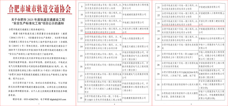 近日,合肥市轨道交通协会公布2025年度合肥市轨道交通建设工程“安全生产标准化工地”名单,江南手机网页版基础设施分江南(中国)承建的合肥市轨道交通6号线一期工程风、水、电、安装及装修总承包项目2标段,合肥市轨道交通7号线一期工程风、水、电安装及装修总承包项目3标段榜上有名。