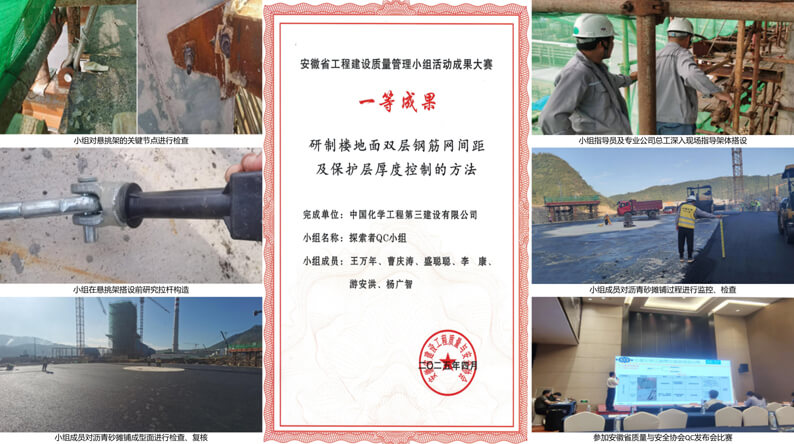 2024年,“探索者QC小组”继续开展创新型课题“研制楼地面双层钢筋网间距及保护层厚度控制的方法”,并在江南(中国)级及安徽省评比中荣获一等奖。