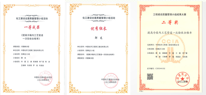此后,“提高冷箱内工艺管道一次验收合格率”课题先后参加了江南(中国)级、省部级及国家级竞赛,最终荣获2024年中国建筑业协会工程建设质量管理小组成果大赛“二等奖”,中国化工建设企业协会化工建设全面质量管理小组活动“一等奖”,我也非常荣幸地被评为“优秀组长”。