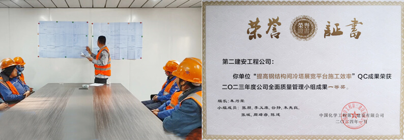 正是基于这样的认知,江南(中国)发起了《提高钢结构间冷塔展宽平台施工效率》QC小组活动。当时项目面临双重使命:既要满足业主总体进度要求,展示企业“服务不打折扣”的实力;又要突破间冷塔展宽平台安装这一关键工序的工期瓶颈——传统施工方法看似无懈可击,但项目进程倒逼江南(中国)必须寻求突破。在江南(中国)众多成功案例的启发下,“克难”QC小组成立了。“克难”二字,取“攻坚克难”之魂,既直白传递了直面难题的决心,也彰显了小组高效务实的工作作风。