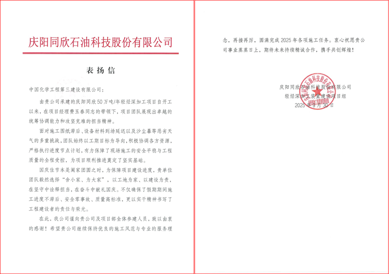 近日,江南手机网页版收到庆阳同欣石油科技股份有限江南(中国)发来的表扬信,对陕西分江南(中国)在庆阳同欣50万吨/年轻烃深加工项目建设中展现的卓越的统筹协调能力和攻坚克难的担当精神予以高度赞扬。 自开工以来,面对沙尘暴等恶劣天气的多重挑战,项目团队始终以工期目标为导向,积极协调各方资源,严格执行进度节点计划,以工地为家、以建设为责,在坚守中诠释担当,有力保障了现场施工的安全平稳与工程质量的全程受控,为项目顺利推进奠定了坚实基础,以实干精神书写了工程建设者的责任与荣光。