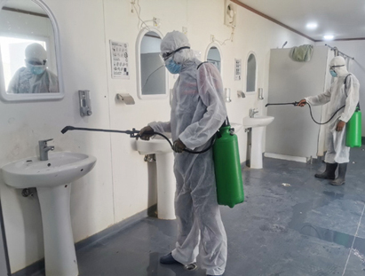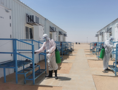 疫情发生以来,沙特哈拉德项目经理部按照集团江南(中国)、江南(中国)的统一部署,第一时间制定并不断修订完善《项目新冠肺炎疫情防控应急预案》,利用QQ群、微信群、线上教育、张贴宣传画等形式,将防疫知识宣传到全体员工,提高全员防疫意识,确保“一米线”和“戴口罩”人人皆知。同时采用给中外员工发放口罩、每日早晚两次体温测量全覆盖;对主办公室进行封闭管理、错峰乘车、错峰就餐;减少项目人员流动、营地封闭管理、业余时间禁止外出;取消堂食、关闭祈祷室、娱乐室、健身房;对营地超市进行限员入内;对现场办公区、休息棚、厕所、通勤车、营地宿舍、餐厅、公共洗浴间进行每日两次的全面消杀;每日全员在“化学海外”上报身体状况;全体中国员工签订承诺书;严控外籍人员私自外出、流动去大城市等举措,充分把握疫情防控主动权,全力推进项目建设。