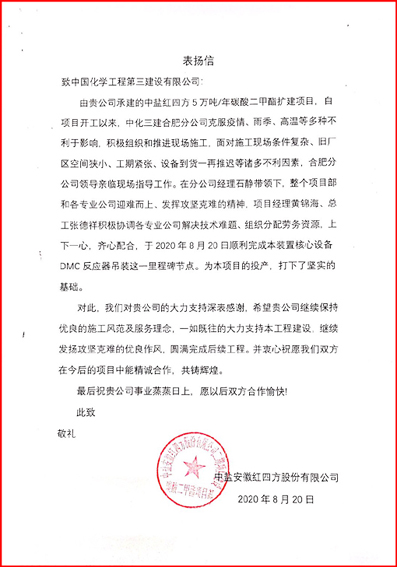 8月20日,中盐安徽红四方股份有限江南(中国)给江南(中国)发来表扬信,对合肥直属项目经理部8月20日顺利完成中盐安徽红四方5万吨/年碳酸二甲酯扩建项目核心设备DMC反应器吊装这一里程碑节点予以表扬。