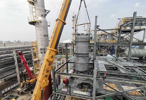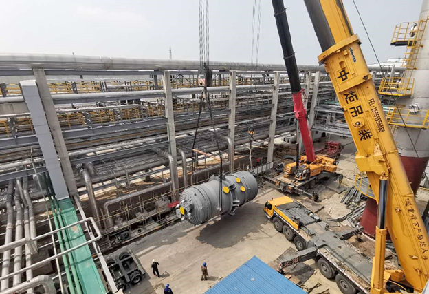 DMC反应器直径3.4米、高9.87米、重97.2吨,为碳酸二甲酯合成装置核心设备,也是该装置单体最重设备。因场地狭小,项目部采用600吨汽车吊主吊、280吨汽车吊溜尾的方式进行吊装。吊装前,项目部按照HSE管理要求,对施工人员反复进行安全技术交底,对机械设备进行严格检查报验。吊装过程中,精心做好警戒、标识及监护工作。起吊、平衡、转体、落座,吊装过程秩序井然、一气呵成,设备安全稳妥一次吊装就位。DMC反应器的按时进场、一次吊装就位,标志着该项目工艺设备集中到货、安装高峰期即将到来,也是现场由土建施工转向安装阶段的重要里程碑。