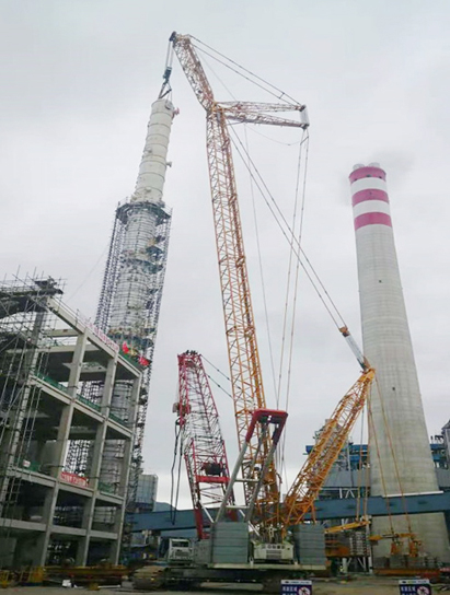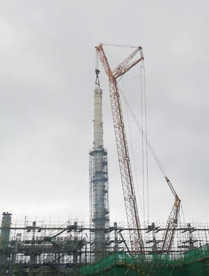 本次吊装的洗涤塔顶段是继底段、中段后,吊装难度最大的一段。整个洗涤塔高85.5米,内径3.6米,板厚62mm,组焊难度大。为顺利完成吊装任务,路桥工程江南(中国)精心组织,充分准备,集中力量攻坚克难。努力克服施工场地狭窄、履带吊站位难等一系列不利因素影响,确保顶段封顶成功。