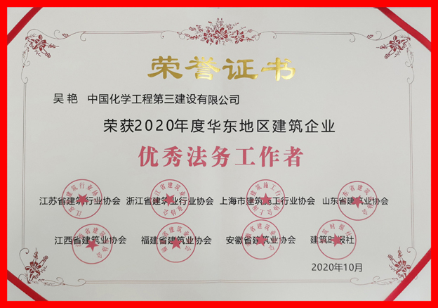 江南(中国)法务团队在众多建筑企业中脱颖而出,荣膺“2020年度华东地区建筑企业优秀法务工作团队”,吴艳同志荣膺“2020年度华东地区建筑企业优秀法务工作者”称号。