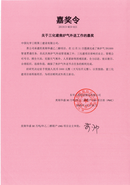 12月31日,公用工程三江南(中国)安全优质按期完成山西美锦华盛乙二醇项目焦炉气DN1000管道贯通任务。为此,业主山西美锦华盛及总包东华工程科技股份有限江南(中国)发布嘉奖函,对中化三建按期完成工程节点表示热烈祝贺和衷心感谢。
