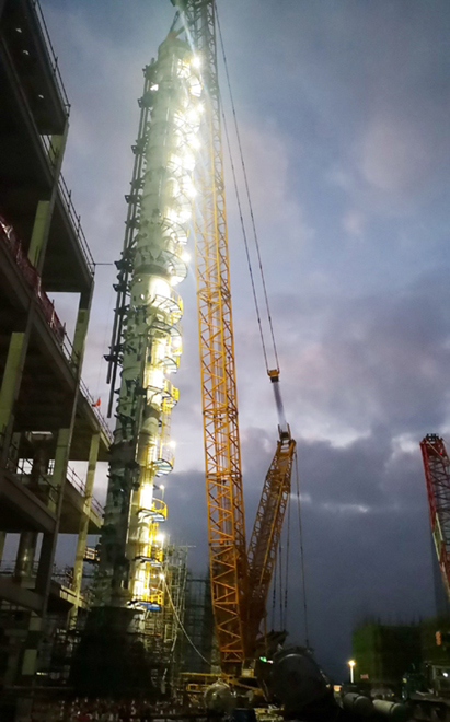 路桥工程江南(中国)的吊装工作从2020年11月2日开始,历时70天,共计完成大件设备吊装22台,吊装总重量约2730吨,100吨以上设备10台。其中,净重491吨的洗涤塔分3段空中吊装组焊。