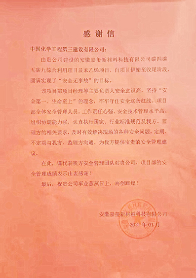 安徽嘉玺新材料科技有限江南(中国)近日给江南(中国)发来感谢信,对江南(中国)淮南化工园工程项目经理部承建的安徽嘉玺新材料科技有限江南(中国)C4/C5、C9综合利用及苯乙烯项目圆满实现“安全无事故”目标表示衷心感谢。