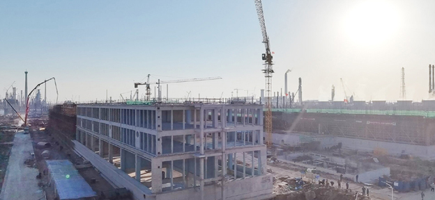 在项目部的精心组织下,建筑工程二江南(中国)连云港斯尔邦项目队适时掀起大干热潮,全体参战员工发扬能吃苦、打硬仗的优良作风,在确保安全、质量的前提下,按时完成业主确定的各项节点计划。目前,已完成化学品库中交;丙烷罐区、经九路、纬三路管廊基础及变电室基本完成施工;2#冷却塔1-10轴(17.1m)已封顶,11-25轴13.2m 层已完成;1#冷却塔9.4m层已完成施工,现场各项施工正平稳有序高效推进,受得业主及相关方的良好评价。