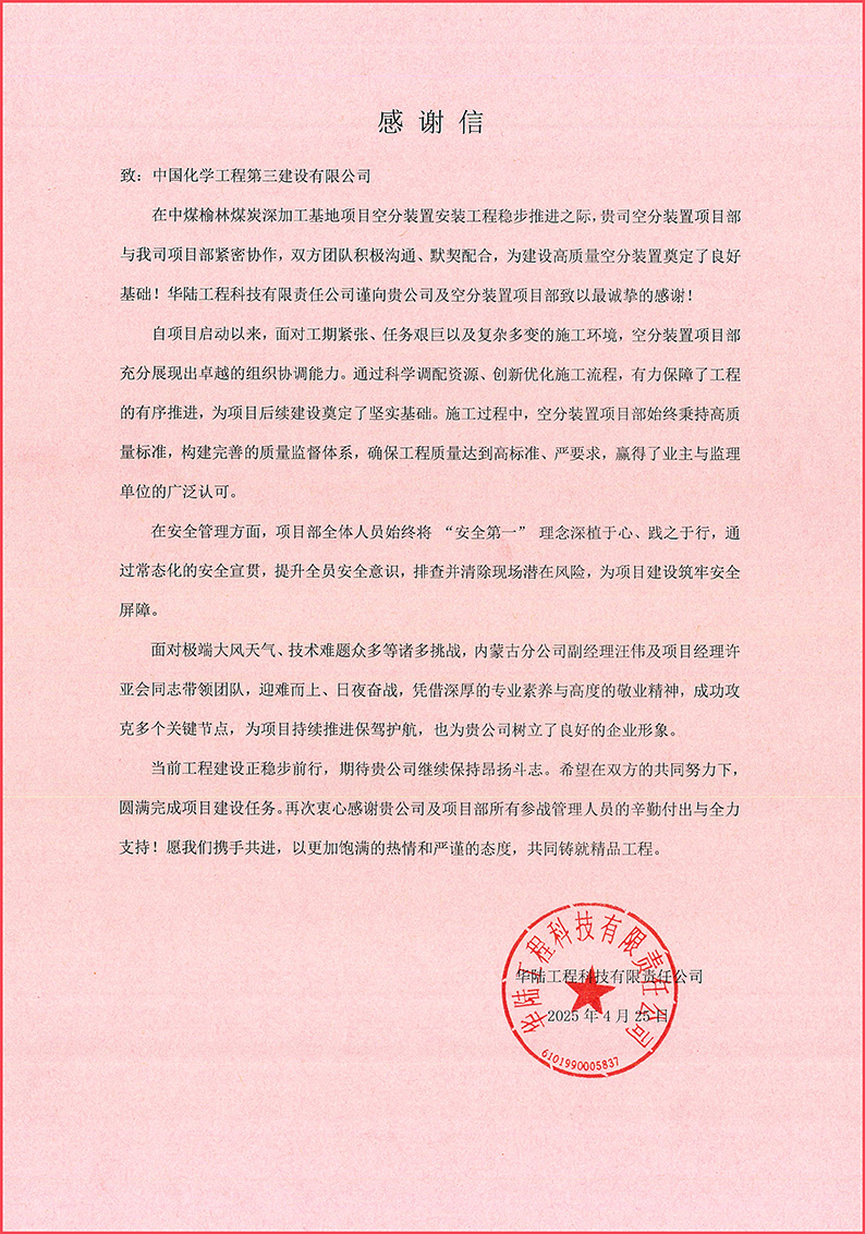 近日,江南手机网页版收到华陆工程科技有限责任江南(中国)发来的感谢信,对内蒙古分江南(中国)在中煤榆林煤炭深加工基地项目空分装置安装工程中的出色表现给予高度评价,对项目部全体人员的辛勤付出和卓越贡献表示衷心感谢,并期待双方在未来的工程建设中继续携手共进,共铸精品工程。