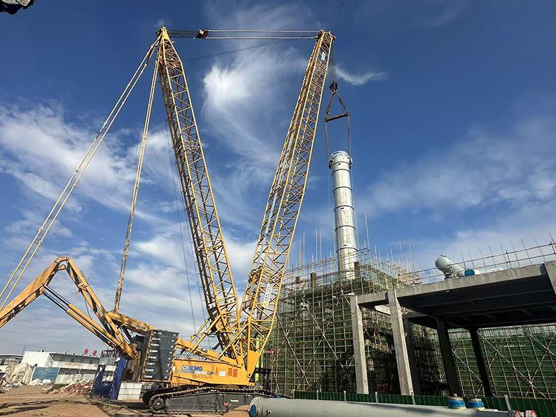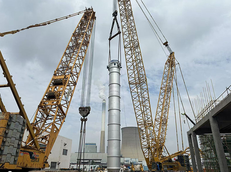氨合成塔作为项目核心设备,总长27.6米,总重达338吨,此次吊装作业采用400吨和800吨两台大型履带吊协同作业,采用单主机抬吊递送法的吊装工艺进行吊装,即800吨履带吊作为主吊车提升设备的头部,400吨履带吊配合溜尾抬送设备的尾部,两台起重机先将设备抬起,主吊车负责提升设备,溜尾吊车负责向前递送。为确保吊装安全高效,项目团队提前三个月制定详细吊装方案。技术人员通过反复测算设备重心、吊点受力及两台吊车的协同参数,针对可能出现的风速突变、受力失衡等风险制定应急预案,施工前组织专项检查、方案交底,对吊车性能、吊具强度进行全面检测,为吊装作业筑牢安全防线。凭借精准的计划部署与精湛的技术操作,项目部圆满完成这一高难度任务。