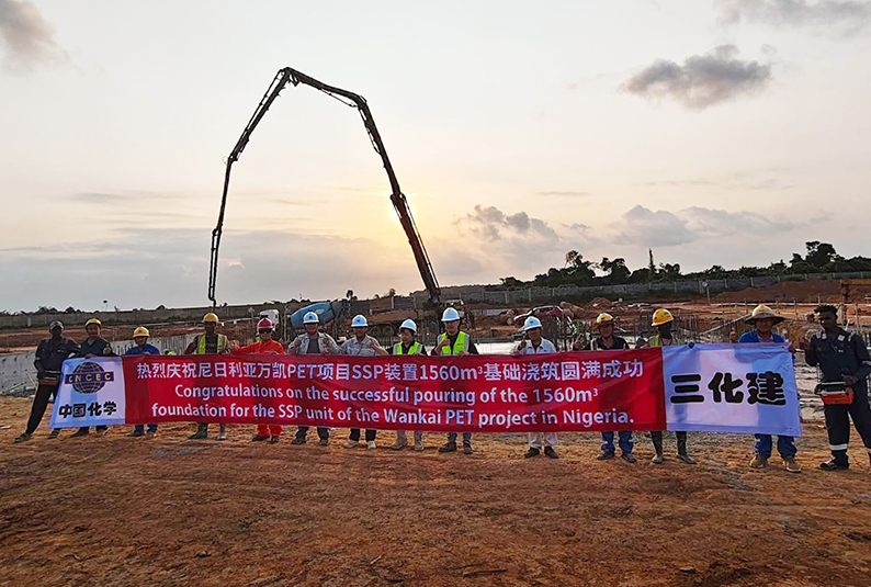 尼日利亚(拉各斯)有限江南(中国)承建的尼日利亚万凯PET项目固相缩聚(SSP)装置筏板基础大体积混凝土浇筑任务圆满完成。项目所在国尼日利亚大体积砼浇筑“高端短缺”的结构性矛盾突出尖锐,商混站稀缺且保供能力差,市政道路路况差并常态堵车。项目部多次召开专题会议,研究合适的浇筑时间,外调备用泵车和罐车,预演浇筑可能出现的突发状况,策划周全的防控措施,坚持一体化管控,持续作业28小时,最终确保此次浇筑取得成功,为项目的推进奠定了坚实基础,赢得了业主的广泛好评。