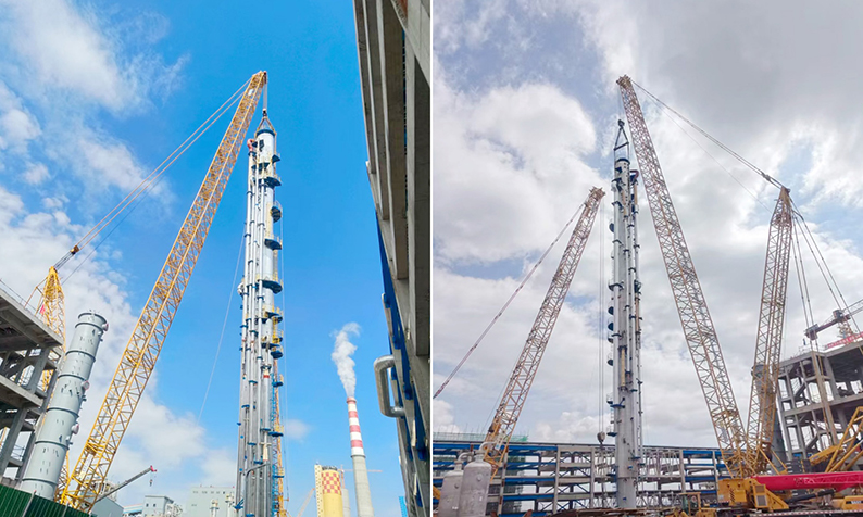 青海直属项目部承建的靖远煤电清洁高效气化气综合利用(搬迁改造)项目二期工程净化合成单元建筑安装工程H2S浓缩塔吊装作业顺利完成。本次吊装的H2S浓缩塔长度达73.23米,直径为3米,总重量达210吨。因体量庞大,吊装难度高,项目团队采用了“单主机抬吊递送法”专业吊装工艺,两台履带相互协同,将设备精准吊运至基础位置并完成安装。此次吊装的顺利完成,不仅体现了项目团队专业的技术水平和高效的协作能力,也为项目按期推进提供了有力保障。