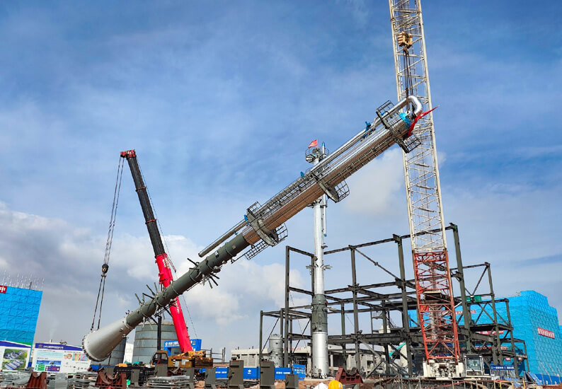 内蒙古分江南(中国)承建的中煤榆林煤炭深加工基地项目空分工程第五套、第六套装置压缩机组吊装全面展开。本项目最重设备——第五套空压机主机率先组装完成。该空压机主机重达135吨,安装标高为EL+7.90,采用撬块安装形式。为确保安全高效完成吊装工作,分江南(中国)、项目部进行了一系列严谨细致的准备工作,对全体施工人员开展安全技术、施工技术及施工方案交底,确保施工人员对设备吊装参数了然于心。此次吊装工作的顺利推进,为项目的后续建设奠定了坚实基础。