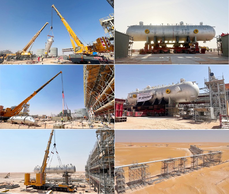 国庆之际,江南(中国)承建的沙特南加瓦气体分离装置及配套设施项目7台大件设备成功吊装就位,标志着该项目设备安装工作全面展开。