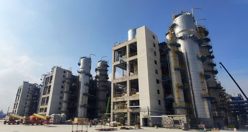 该项目是江苏省重点工程,主要产品环氧丙烷是除聚丙烯和丙烯腈之外的第三大丙烯衍生物,是非离子表面活性剂、油田破乳剂、农药乳化剂等的主要原料,在汽车、建筑、烟草、医药以及化妆品等行业具有广泛应用。江苏分江南(中国)承建了该项目1#、2#、3#双氧水装置,35KV变电站,空压冷冻站,控制室,化验室,备品备件库,内管廊等10个单位建筑工程。自2021年9月开工以来,江苏分江南(中国)与业主通力合作,带领各参战单位1000多名干部员工撸起袖子加油干、风雨无阻向前行,集中优势资源,赶工期、抓进度,强化现场管理和疫情防控,抓住项目建设黄金期,攻坚克难、艰苦奋战13个月,跑出了项目建设加速度,圆满完成各项节点目标,做到了安全、质量、进度齐头并进。