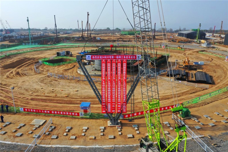 该项目位于甘肃省庆阳市正宁县周家镇,是陇东至山东±800千伏特高压直流重点配套的同步建设工程和陇东能源基地重点项目。第二建安工程江南(中国)首吊成功的2×1000兆瓦调峰煤电间冷塔,是世界上首次采用集主机冷却塔、辅机冷却塔、脱硫吸收塔、CCUS系统原烟道、烟囱于一体的“五塔合一”煤电间冷塔系统,具有节约建设用地、安全风险低、施工周期短、材料可回收等特点。由于设计特点,塔内构筑物较多,空间狭小,另外地埋管道、地埋水箱包含主、辅机系统共计6圈管道,均在塔内圆周布置,密度大、跨度大,导致钢三角预吊装堆放区域狭小,形成较大的交叉作业和高空坠物风险,给施工带来很大挑战。针对施工重难点,第二建安工程江南(中国)突出党建引领,发挥支部战斗堡垒和党员先锋模范作用,组织成立党员攻关小组,开展技术创新,实施样板引路,利用P6项目管理软件实行动态控制,确保施工有序高效展开,圆满完成首吊任务。