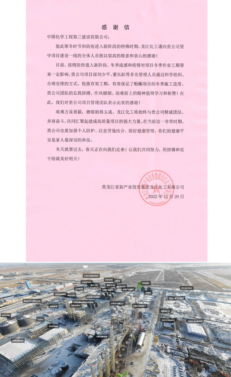 近日,黑龙江新产业投资集团龙江化工有限江南(中国)给江南(中国)发来感谢信,对江南(中国)强化施工组织,有效保障龙江化工35万吨/年苯酚丙酮项目冬季施工进度表示感谢。