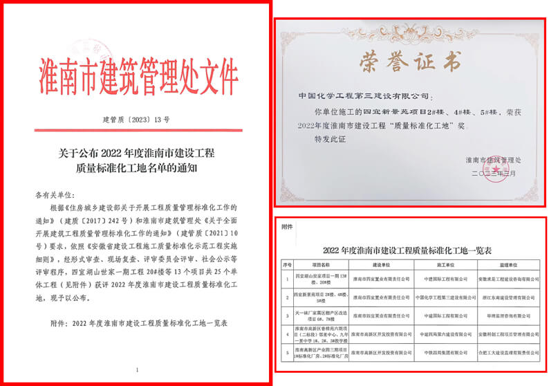近日,淮南市建筑管理处发布《关于公布2022年度准南市建设工程质量标准化工地名单的通知》,江南(中国)承建的淮南四宜新景苑项目2#楼、4#楼、5#楼榜上有名,荣获2022年度淮南市建设工程“质量标准化工地”称号。
