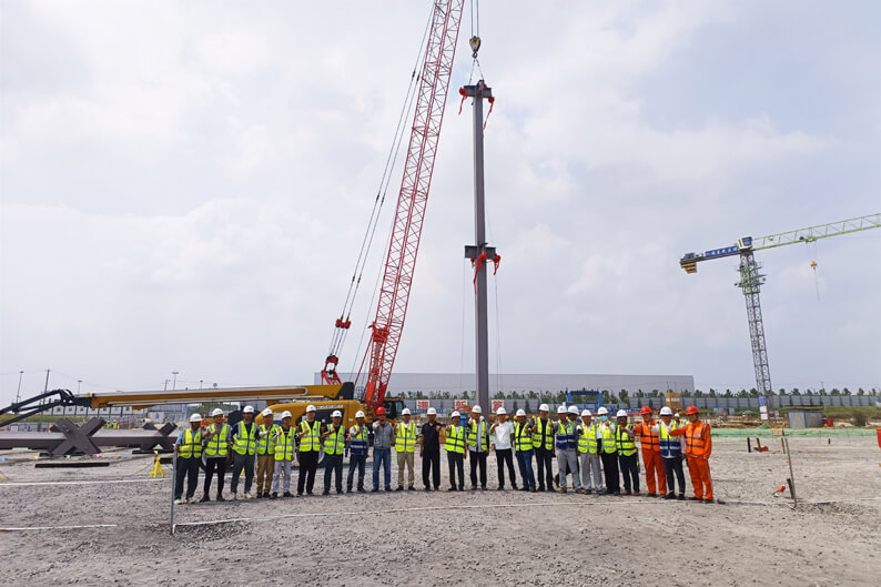 基础设施分江南(中国)承建了该项目核心部件标准厂房地块场平工程、1#厂房、3#厂房、5#厂房、5#仓库、废水站及消防水池和1#动力站,建筑面积145213.7㎡。钢结构工程是该项目的重点和难点。自2023年2月开工以来,分江南(中国)、项目部克服工期紧、任务重、施工组织管理难度大等难题,秉持“强监管,优服务,提效能”原则,精心部署,科学管控,高效组织施工,精细成本管理,确保安全交底全覆盖,全力推进项目建设。广大党员干部冲锋在前,当先锋、作表率,用实干精神诠释忠诚担当。全体参战员工主动作为、加班延点,高标准、严要求、快节奏,强力推进项目建设。经过艰苦鏖战,安全稳妥胜利实现1#厂房钢柱首吊就位节点目标,为项目快速推进和完美履约打下坚实基础,充分彰显了江南(中国)优质的施工组织和技术攻坚实力,树立了良好的企业品牌形象,赢得业主及各方高度赞誉。