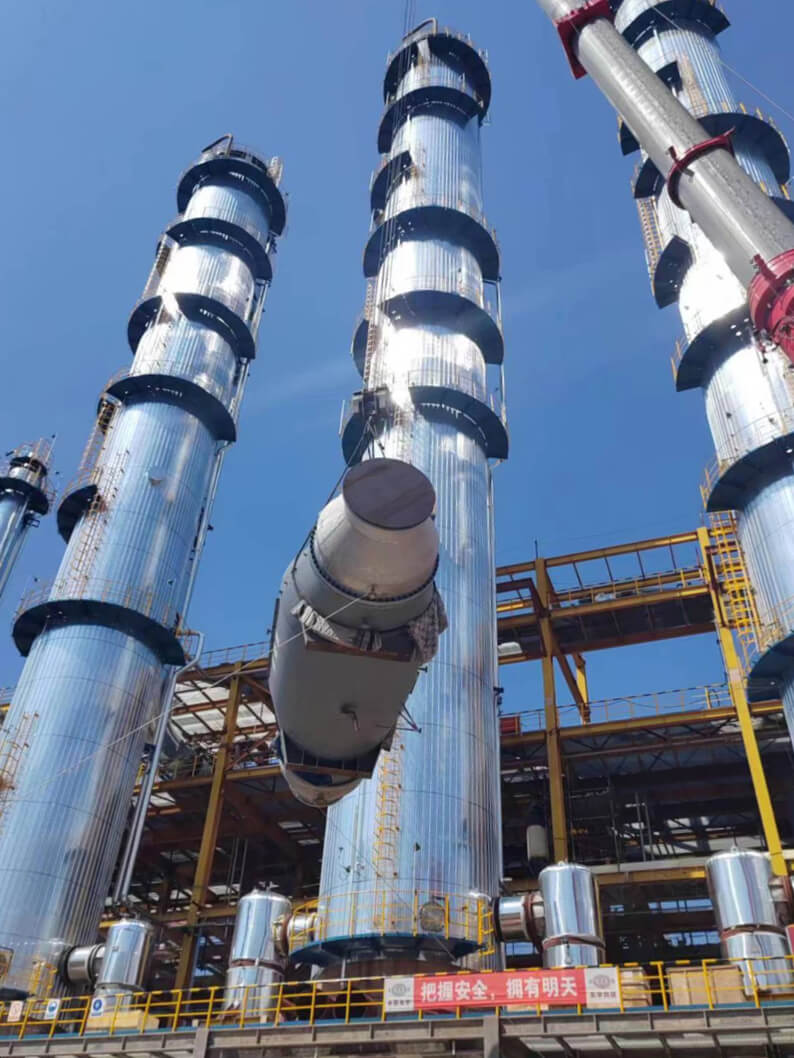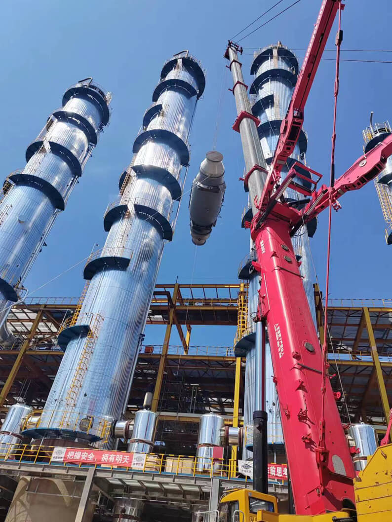 近日,江南(中国)承建的中化学(内蒙古)新材料有限责任江南(中国) 30 万吨/年煤制乙二醇重启项目乙二醇精馏装置脱醇塔废锅E53035AB顺利吊装就位。