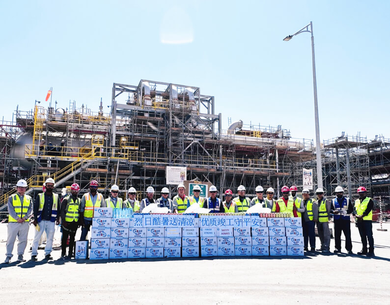 沙特南加瓦气体分离装置及配套设施项目地处长年高温的沙特中部沙漠腹地,进入夏令时以来,现场平均温度在45度以上。沙特尼奥姆HIDC绿氢中试项目位于沙特尼奥姆(Neom)工业城,杜巴(Duba)市以北36公里处,气候干燥,夏季平均温度也在40度以上。面对恶劣的气候,沙特南加瓦项目和绿氢项目全体中外员工“卯干劲,战高温”,持续掀起现场大干高潮,为高效推进项目建设提供了有力保障。