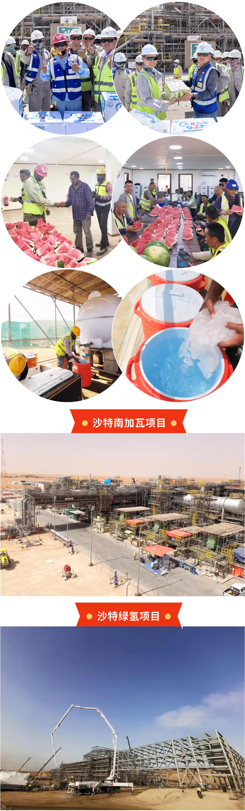 为做好防暑降温工作,保障广大参战员工健康安全,近日,沙特分江南(中国)南加瓦项目经理部和绿氢项目经理部分别组织开展“情系一线 夏送清凉”活动。