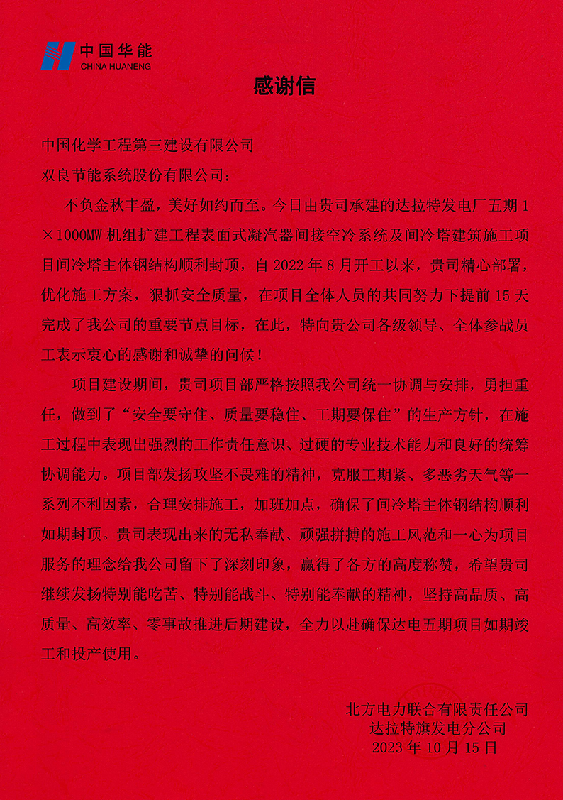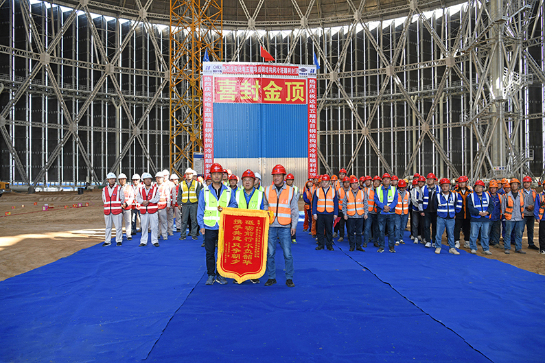 该工程间冷塔为表面式凝汽器间接空冷系统钢结构塔,由圆锥、直筒、加强环等钢结构件及外围护铝板等组成,塔体总高192米(蒙皮顶标高),锥段底部直径120米,直筒段直径84米。自2022年8月开工以来,承担工程建设任务的第二建安工程江南(中国)科学谋划、精心组织,严格落实各项制度、持续优化施工方案,深入推进精细化管理,防微杜渐抓质量、警钟长鸣保安全。项目全体参战员工积极响应“奋战四季度 欢庆七十载”活动号召,发扬“特别能吃苦,特别能战斗,特别能奉献”的中化三建优良作风,克服困难、创造条件、加班延点、拼搏奉献,全力推进现场施工进度,较业主原定计划提前15天实现钢结构间冷塔封顶目标,为整体推进五期工程建设奠定了坚实基础,获得业主和相关方的一致好评。