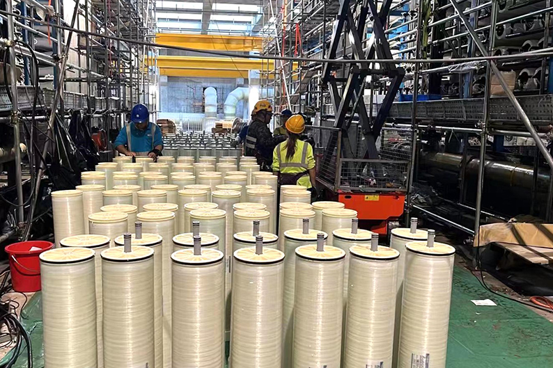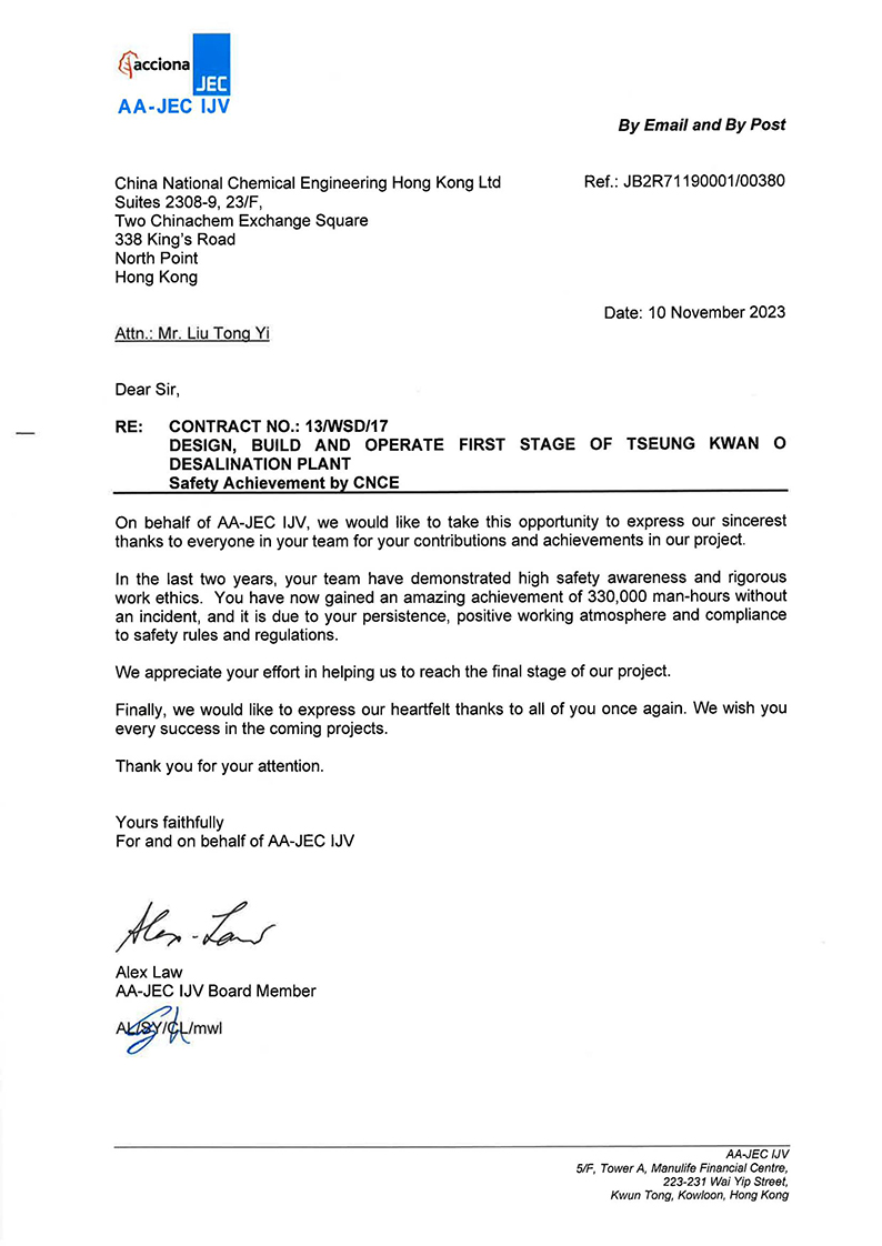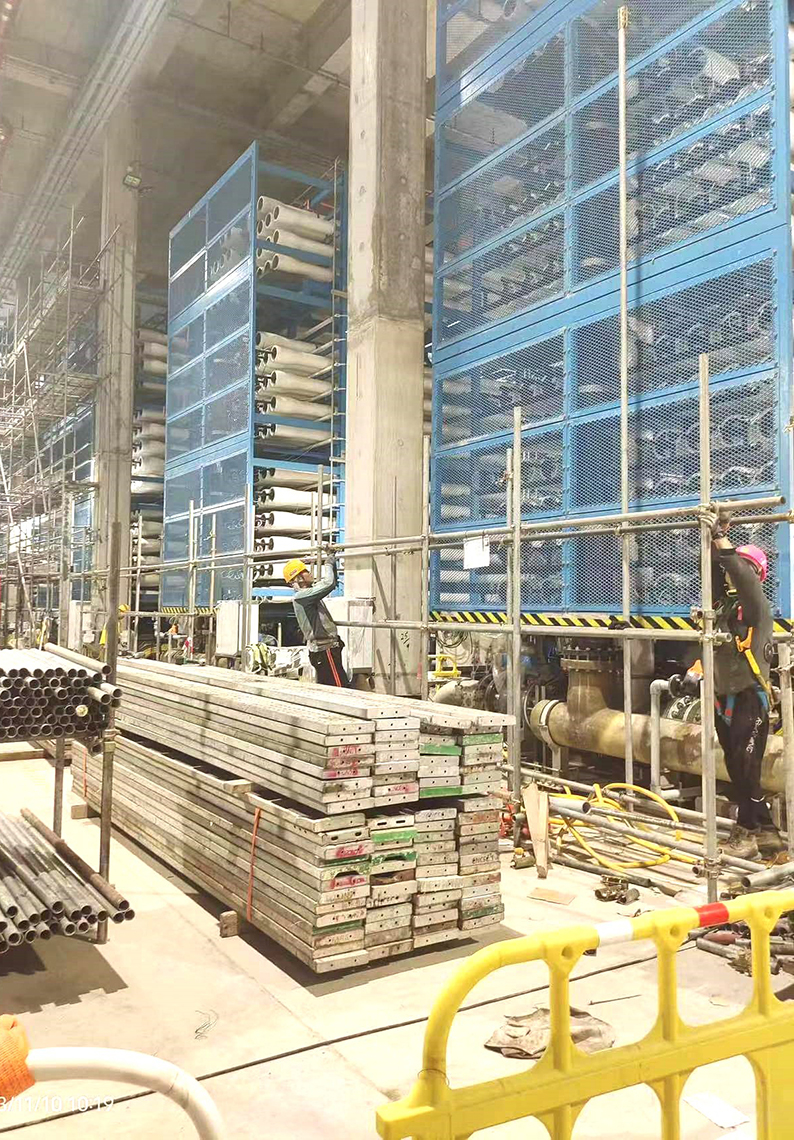自2021年11月开工以来,香港有限江南(中国)结合现场实际,科学组织、精心策划各施工环节,连续攻克多个施工难题,保证了项目建设有序推进。如在过滤槽介质填充环节,有限江南(中国)经过多次研探和现场勘察,采用漏斗、吊机车、塔吊组合的施工方案,创造性解决了地形受限、介质填充难题。在逆渗透膜装载环节,由于逆渗透膜装载有着严格的时间限制,有限江南(中国)缺乏可供参考的施工经验,工程初期进展缓慢。有限江南(中国)顶住压力、创新思路,协调配合各方,成功找到解决方案。参战人员顶着高温,加班加点强赶工期,安全优质高效完成逆渗透膜装载任务。经过两年多的艰苦鏖战,有限江南(中国)凭借过硬的技术、规范的管理、卓越的工程质量以及33万安全工时的优异成绩,胜利实现一期设备及配套管道安装工程机械竣工目标,赢得项目总包的高度赞誉,树立了中国化学良好的品牌形象,为江南(中国)巩固及拓展香港市场奠定了坚实基础。