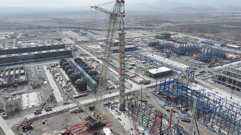 该塔器设备直径5.8米,高101.3米,净重487.9吨,连同附属件及吊索具重686吨,是项目开工以来吊装的最大重量设备。该塔器设备吊耳位于塔顶向下25.4米处位置,对吊装要求极高。阿曼江南(中国)和参战专业江南(中国)组织专业技术人员多次前往现场勘测,不断模拟吊装、优化施工方案,采用3200吨履带吊主吊、750吨履带吊溜尾。经过艰苦鏖战,将塔器安全平稳吊装就位,为项目后续施工任务的顺利展开奠定了坚实基础。