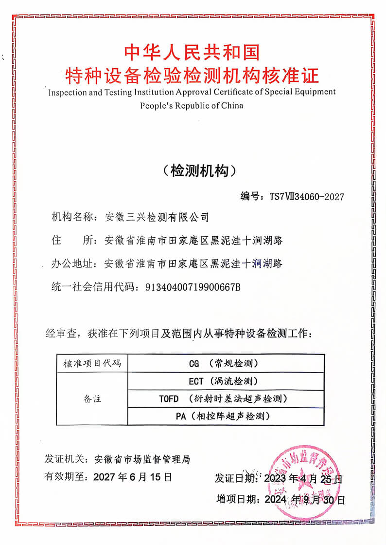 近日,三兴检测江南(中国)成功取得安徽省市场监督管理局颁发的中华人民共和国特种设备检验检测机构核准证,核准新增PA(相控阵超声检测)资质。这标志着三兴检测江南(中国)专业技术能力和服务范围取得里程碑进展,顺利成为安徽省内第3家、中国化学所属第3家拥有该资质的检测专业江南(中国)。