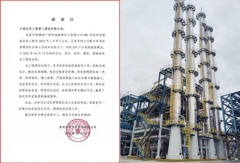 项目自今年1月开工,历经270个日夜的紧张施工,分江南(中国)全面完成项目建设任务。中交检查总结会上,业主华谊集团领导表示,中化三建面对复杂施工环境和紧张的工期压力,始终保持积极态度,高效施工,按期优质高效完成各施工节点任务,彰显了中化三建卓越的工程建造实力。总包东华江南(中国)专门给江南(中国)发来感谢信,表示项目建设过程中,中化三建领导多次深入现场组织协调,项目团队严格按照施工技术程序施工,落实安全、质量管理要求,顺利完成塔设备安装、管道吹扫和试压、设备调试等关键节点,对此向中化三建表示衷心感谢。