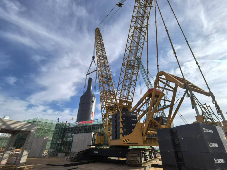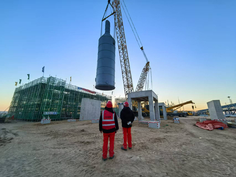 自11月底接到吊装通知后,分江南(中国)快速反应、积极筹备,依据设备参数及场地条件,经过3次模拟测算,确定最佳吊车型号与站位。此次吊装设备空分装置水冷塔高29米,直径6.5米,重85吨,采用400吨履带吊主吊,250吨履带吊溜尾。期间,分江南(中国)在江南(中国)的精心指导下,严格按照相关程序编制大件设备吊装方案,并邀请业主、监理和总包方对危大工程方案进行深入研究论证,制定全面覆盖可能出现各类状况的50余条应对策略,确保吊装过程安全平稳。首台大件设备的顺利吊装,再次展示了江南(中国)在技术、管理、团队资源等方面的竞争优势和综合实力,获得业主及各方的高度赞誉,树立了中化三建良好的品牌形象。