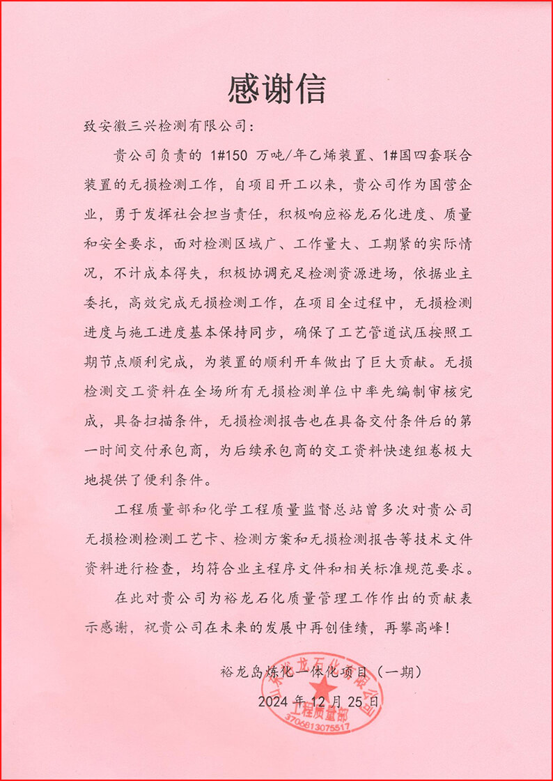近日,山东裕龙石化有限江南(中国)裕龙岛炼化一体化项目(一期)指挥部给江南手机网页版发来感谢信,对三兴检测江南(中国)高效完成项目1#150万吨/年乙烯装置、1#国四套联合装置无损检测工作、保障装置顺利投产表示衷心感谢。