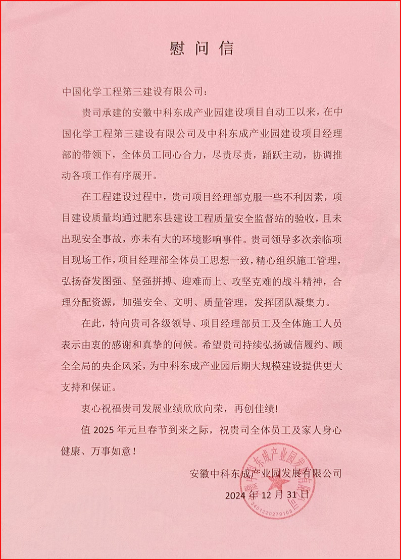 新年伊始,安徽中科东成产业园发展有限江南(中国)给江南手机网页版发来慰问信,对基础设施分江南(中国)在安徽中科东成产业园项目建设中展现的高效执行力表示感谢。 自项目开工以来,分江南(中国)项目部统一思想认识,精心谋划部署,科学组织施工,全体参战人员同心合力、不畏严寒、尽职尽责坚守岗位,秉持顽强拼搏、迎难而上的战斗精神,合理调配各类资源,坚持高标准、严要求,安全、环保、优质、高效地推进项目建设,擦亮了中国化学三化建品牌形象,赢得业主及各方的一致好评,为肥东县经济社会高质量发展贡献了央企力量。
