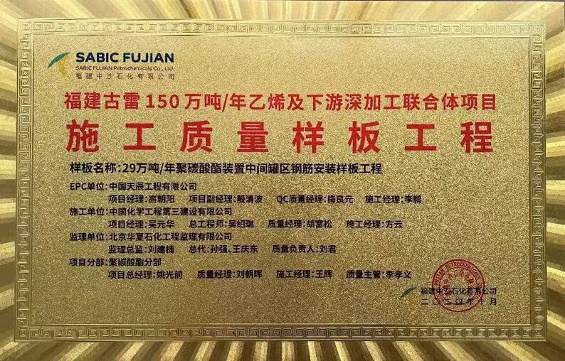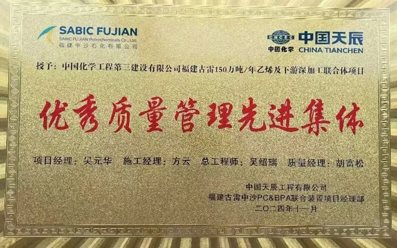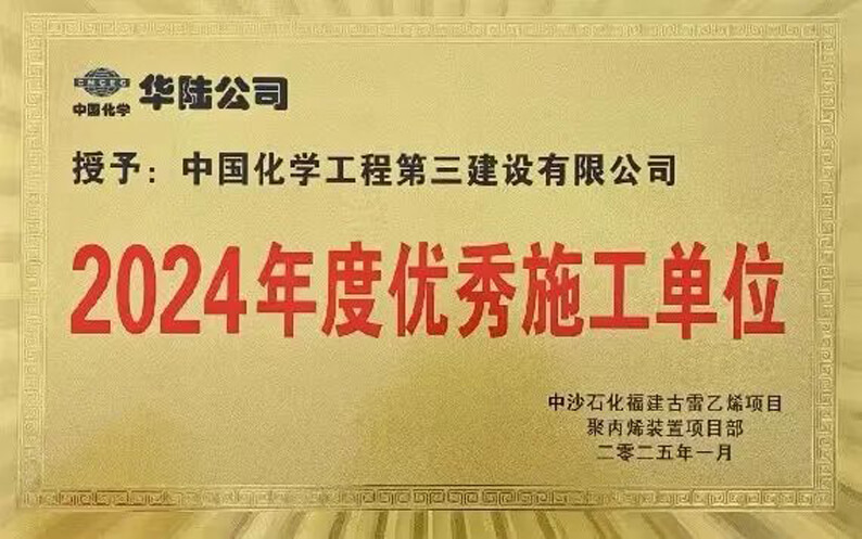 聚丙烯项目部获总包“2024年度优秀施工单位”荣誉称号;双酚A项目部获业主“2024年度优秀单位”和总包“优秀质量管理先进集体”荣誉称号;乙烯附属装置项目部获总包“2024年度安全管理先进单位”荣誉称号,双酚A和聚丙烯项目获业主“施工质量样板工程”,彰显了业主和总包对江南(中国)施工技术和项目管理的高度认同,擦亮了三化建“金字招牌”,为江南(中国)巩固和拓展周边市场奠定了坚实基础。