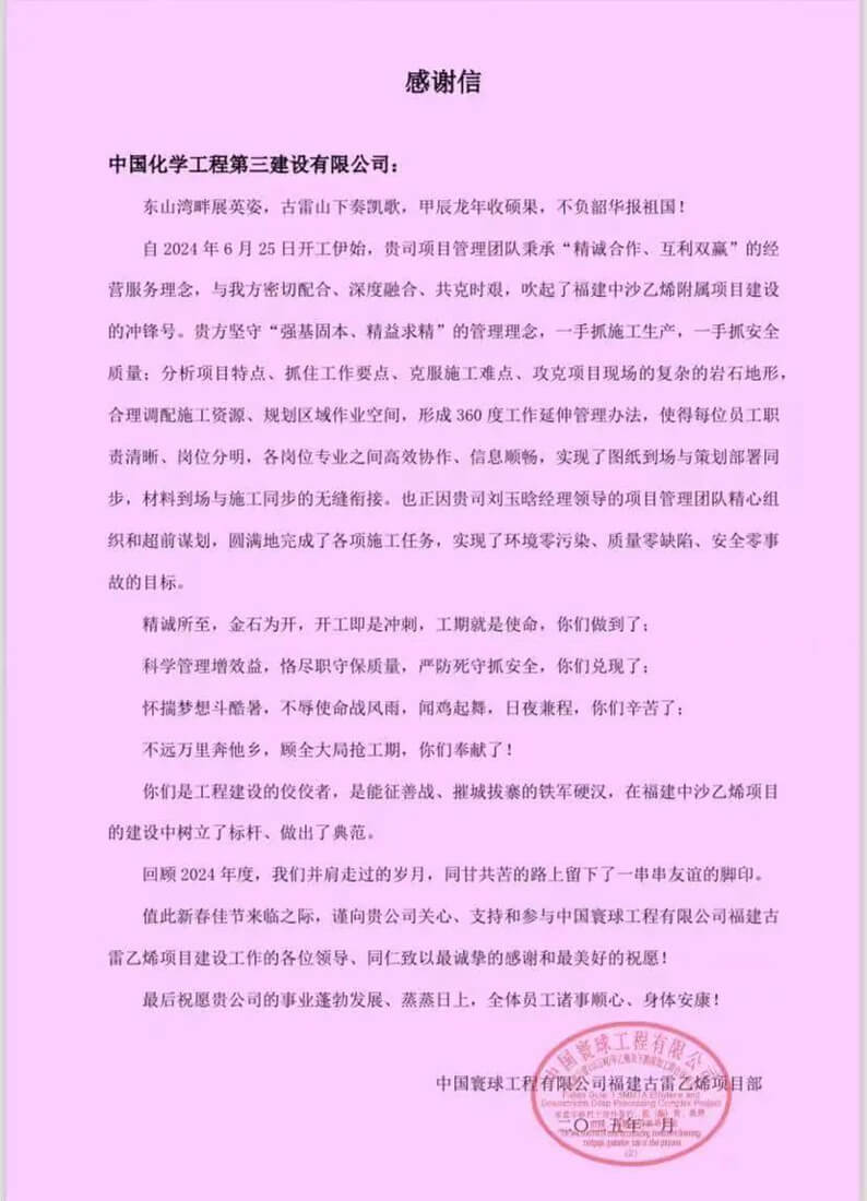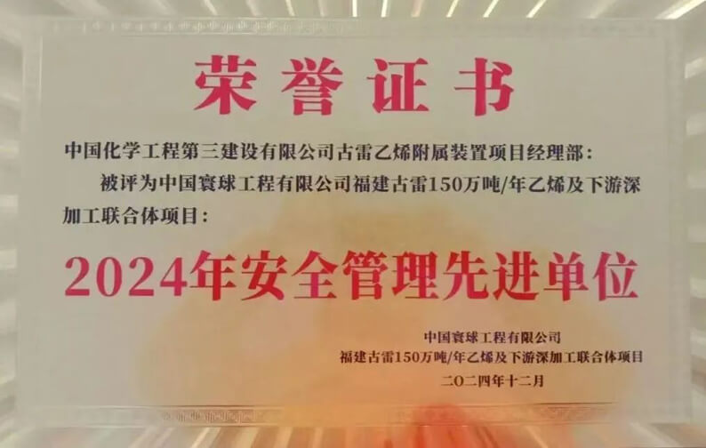 新年新气象,江南手机网页版华南分江南(中国)承建的福建中沙古雷150万吨/年乙烯及下游深加工联合体项目捷报频传,荣获业主及总包单位授予的“2024年度优秀单位”“施工质量样板工程”“优秀质量管理先进集体”“2024年度安全管理先进单位”等多项荣誉称号。