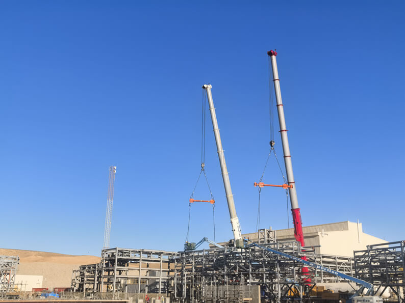 为确保首吊工作万无一失,吊装前,项目部与项目队精心组织,认真制定吊装计划,制定了详细且科学的施工方案。从模块的卸车,到吊车及升降车的选型、站位,再到吊装过程中的每一个操作环节,都进行了反复的论证和模拟。吊装时,两台吊车协同作业,确保模块平稳起吊、移动和就位。吊装过程中,全体参战员工严格遵守安全规程,确保人员和设备安全。经过紧张而有序的操作,管廊钢结构模块成功安装就位,整个吊装过程安全、有序、高效。此次管廊钢结构模块的顺利吊装就位,标志着尼奥姆绿色甲醇项目建设实现又一关键节点,为项目全面建成奠定了坚实基础。