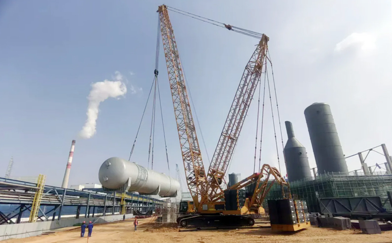 吊装作业中,分子筛A和B的规格均为ф5500*28984mm,重量高达134.7吨,属于大型卧式设备,且没有吊耳。为确保吊装顺利完成,项目团队选用400吨履带吊配230吨超起装置进行主吊,主臂长度为66米,回转半径为26米,起重能力达到196.9吨。经过精心组织和严谨操作,项目团队成功将第六套空分装置的分子筛A和B安全吊装就位,充分彰显了专业江南(中国)的技术实力和精湛技艺,树立了良好的企业品牌形象,为后续设备吊装积累了宝贵经验、奠定了坚实基础。
